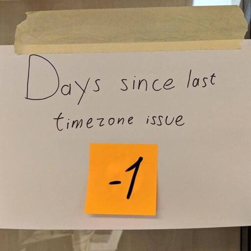 ☆ Yσɠƚԋσʂ ☆@lemmy.ml to Programmer Humor@lemmy.mlEnglish · 4 days agoDays since last timezone issueimagemessage-square1linkfedilinkarrow-up1130arrow-down10cross-posted to: programmer_humor@programming.dev
