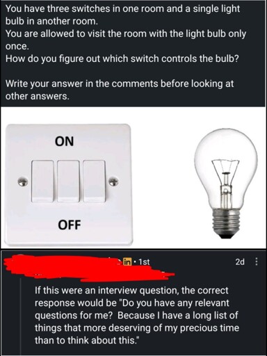 You have three switches in one room and a single light bulb in another room. You are allowed to visit the room with the light bulb only once. How do you figure out which switch controls the bulb? Write your answer in the comments before looking at other answers.