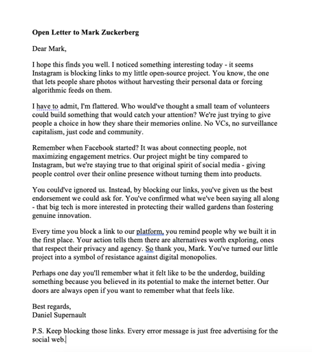 Dear Mark, I hope this finds you well. I noticed something interesting today - it seems Instagram is blocking links to my little open-source project. You know, the one that lets people share photos without harvesting their personal data or forcing algorithmic feeds on them. I have to admit, I’m flattered. Who would’ve thought a small team of volunteers could build something that would catch your attention? We’re just trying to give people a choice in how they share their memories online. No VCs, no surveillance capitalism, just code and community. Remember when Facebook started? It was about connecting people, not maximizing engagement metrics. Our project might be tiny compared to Instagram, but we’re staying true to that original spirit of social media - giving people control over their online presence without turning them into products. You could’ve ignored us. Instead, by blocking our links, you’ve given us the best endorsement we could ask for. You’ve confirmed what we’ve been saying all along - that big tech is more interested in protecting their walled gardens than fostering genuine innovation. Every time you block a link to our platform, you remind people why we built it in the first place. Your action tells them there are alternatives worth exploring, ones that respect their privacy and agency. So thank you, Mark. You’ve turned our little project into a symbol of resistance against digital monopolies.